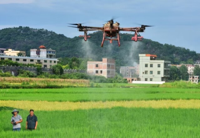 (嘉禾县珠泉镇富溪村,村民在操作无人植保机为水稻喷洒农药。黄春涛 摄)