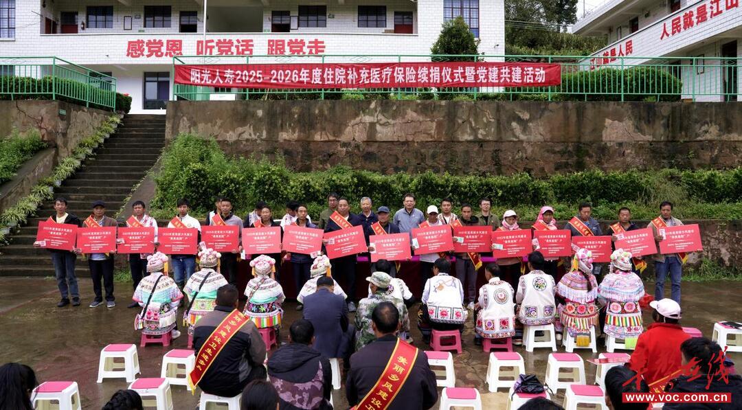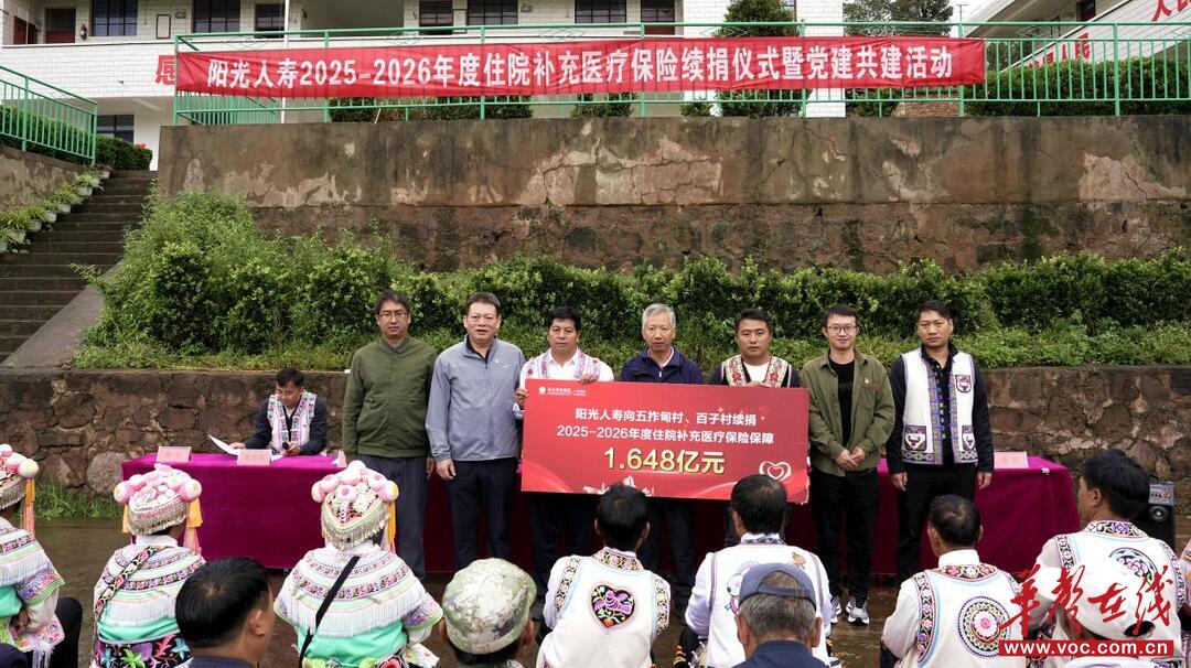 华声在线10月22日讯(通讯员 彭溪)近日,阳光人寿在楚雄州武定县猫街镇五拃甸村举行“2025-2026年度住院补充医疗保险续捐仪式”,向五拃甸村、百子村共计1648位村民,再次捐赠新一年度的住院补充医疗保险保障。本次捐赠对村民基本医保报销后的合理住院费用进行补充赔付,其中建档立卡脱贫户及三类人员将实现100%报销,捐赠总风险保额达1.648亿元。