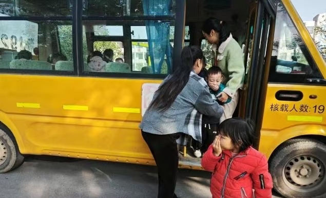 演练开始啦,小朋友们按照日常坐校车的实际情况进行演练:有序上校车→随车老师点名确认人数→坐到指定座位并系好安全带→校车启动出发。