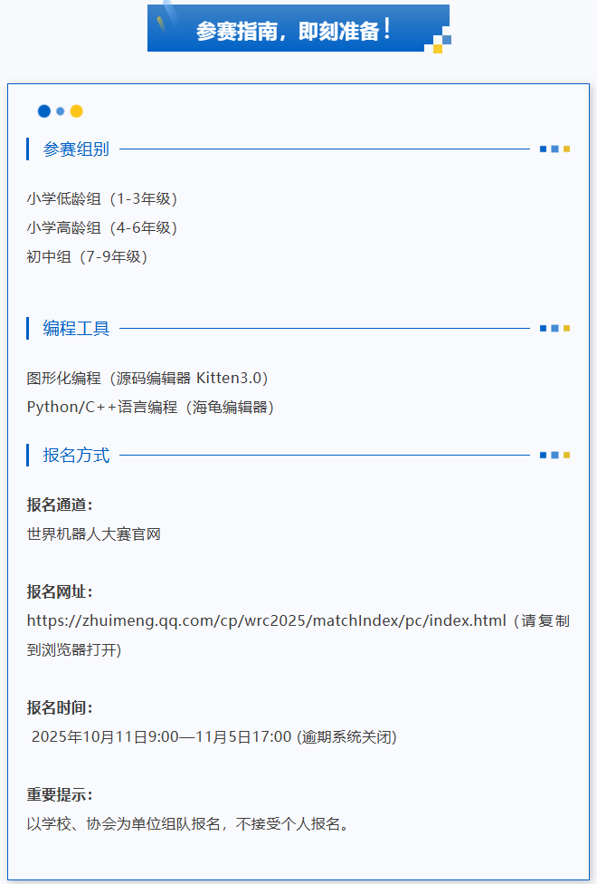 从赛事组委会获悉,“世界赛!郴州场!”WRC2025 世界机器人大赛湖南省选拔赛,将于2025年11月15日至16日在郴州智能科技职业学院正式拉开帷幕。这不仅是湖南青少年科技领域的年度盛事,更是郴州向世界展示城市科创实力与人工智能教育成果的重要窗口。