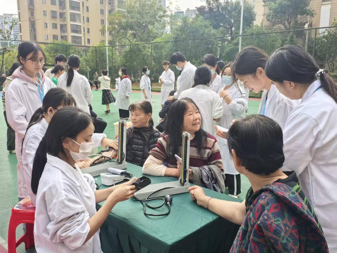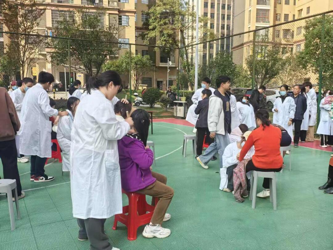 活动现场,来自湖南中医药大学的大学生志愿者们充分发挥专业特长,为闻讯前来的社区居民提供了一系列内容丰富、形式多样的志愿服务。现场设置了多个服务区,志愿者们耐心细致地为居民们提供测量血压、健康咨询、中医推拿、艾灸调理、拔火罐以及中药养生知识科普等服务。