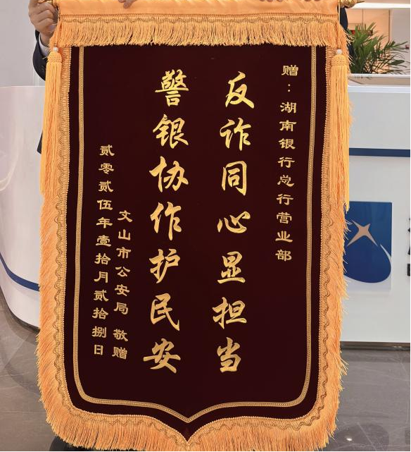 华声在线11月5日讯(通讯员 张忆琳)近日,湖南银行营业部因在协助公安机关开展涉案账户调查工作中表现突出,得到文山市公安局高度认可,获赠一面印着“反诈同心显担当 警银协作护民安”的锦旗。