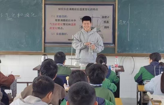 本次公开课上,万法安老师通过“水的沸腾实验”“晾晒衣物”等分组探究活动,让学生直观观察汽化、液化的过程,清晰感知“汽化吸热、液化放热”的规律,既突出了“蒸发与沸腾的区别”“液化的两种方式”等教学重点。在互动探究环节,他耐心指导实验操作,倾听每一位学生的发现与疑问,引导学生将物理知识与生活实际结合,在思维碰撞中深化理解。