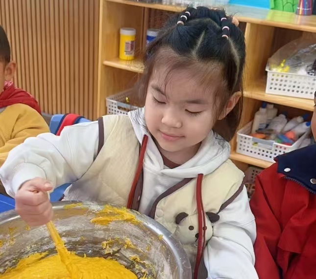 活动前,老师们精心筹备,挑选新鲜饱满的南瓜,备好糯米粉、白糖等食材,还提前将南瓜蒸熟压成细腻的南瓜泥。活动开始后,老师通过生动的故事引出南瓜的营养价值,展示南瓜饼制作步骤,耐心讲解操作要点与安全注意事项。