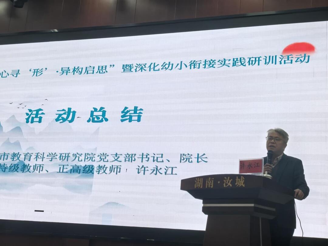 活动尾声,郴州市教育科学研究院党支部书记、院长许永江进行总结,强调幼小衔接背后的原因以及课程开展的问题所在,用小故事鼓励教学要贴近孩子现有知识体系,要在孩子们现有知识框架的基础上符合孩子身心发展特点进行教学。