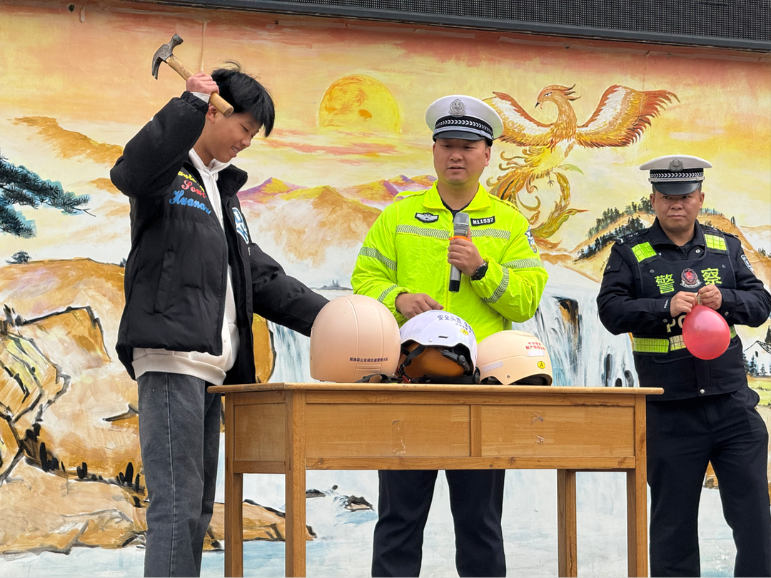 理论讲解之余,活动还设置了趣味模拟体验环节。“砸头盔”实验直观展示了安全头盔的防护效能,“汽车盲区体验”则让师生亲身体验了车辆视线盲区的潜在危险,进一步加深了大家对遵守交通规则重要性的认识。现场互动热烈,师生们在实践中深化了对交通安全知识的理解与记忆。