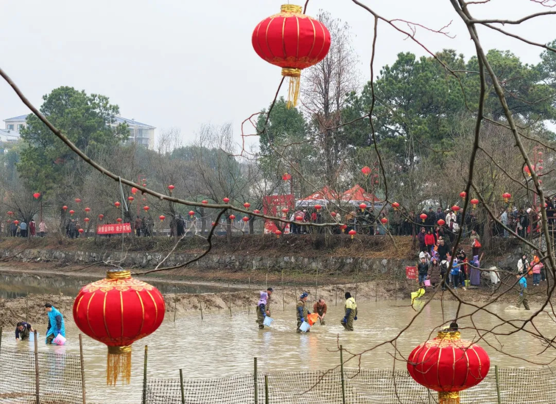 (2月6日,衡阳市珠晖区举办干塘摸鱼等迎新春系列活动。曹正平 唐兰荣 摄)