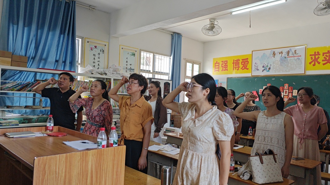 最后,全体教师昂首挺立,紧握右拳,重温誓词。声声誓言如铁流奔涌,在梁柱间铿锵回荡。“我是一名洞口县光荣的人民教师……”这共同的誓约将教师的心瞬间凝聚,把平凡的日子熔铸成永恒的信仰。余音渐散,唯有目光愈发坚定——她们即将在这三尺讲台,践行这重于泰山的承诺。