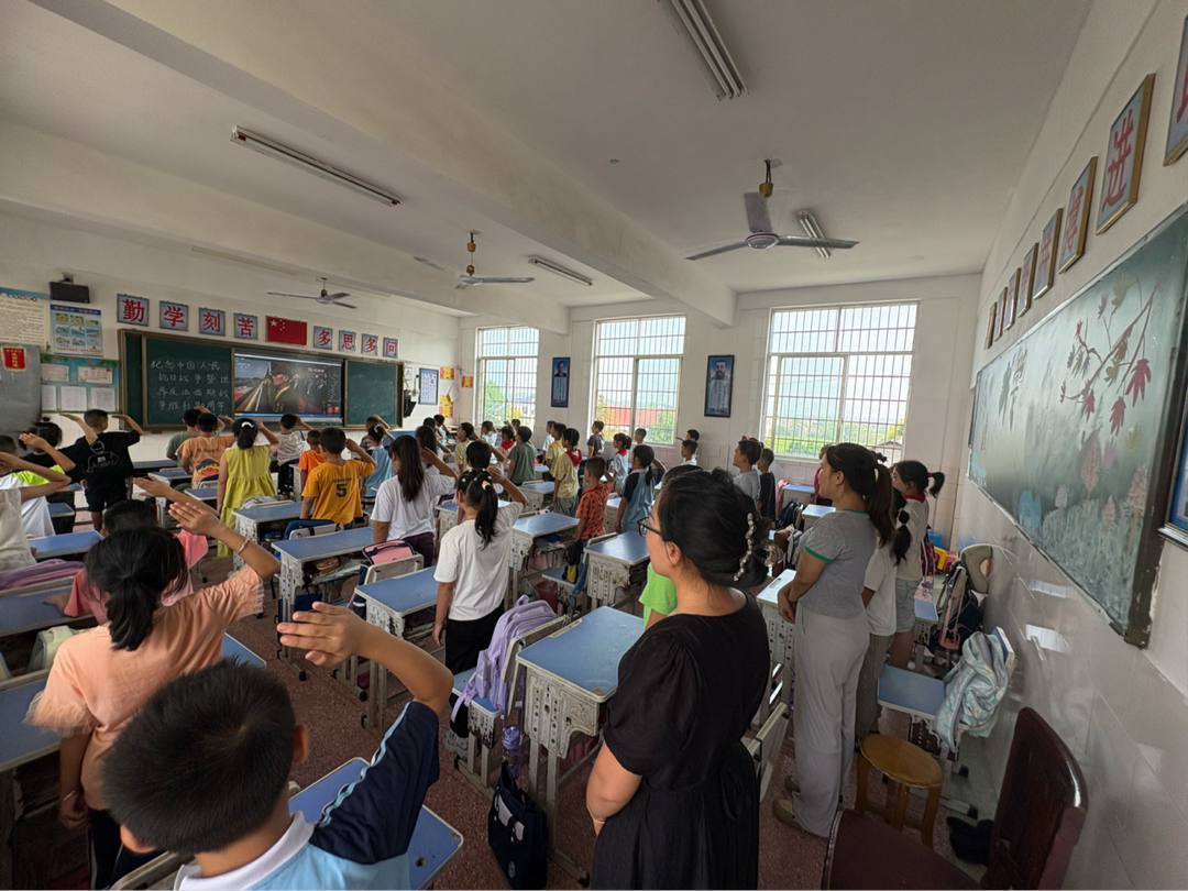 桃源县架桥镇中心小学组织全体师生集中观看九三阅兵仪式