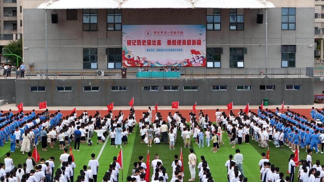 华声在线9月10日讯(通讯员 孟菁菁)秋光正好,微风和畅。9月9日上午,邵东市第一实验学校全体师生齐聚校园绿茵场,举行以“铭记历史砺壮志,勇担使命启新篇”为主题的秋季开学典礼。学校党支部书记张金涛、校长李敏及全体校务会成员出席,共同见证新学期的开启。