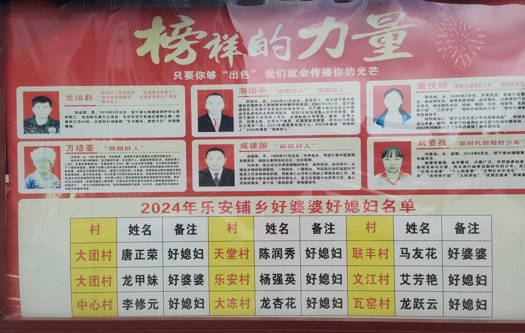 这一“拾金不昧”的善举,只是乐安铺乡群众厚文明素养的一个缩影。在这片土地上,“好人”故事不断涌现——“湖南好人”游国平以行动践行军人初心,临危不惧勇救跌入海水游客;“邵阳好人”万培亚立足平凡岗位,发挥余热,传递向上向善力量。为让“好人好事”蔚然成风,该乡已连续多年常态化开展“厚文明家庭”“社会主义核心价值观先进人物”评选,涵盖“助人为乐”“敬业奉献”“民族团结”“好婆婆”“好儿媳”等类别。通过“群众推荐、村组评议、乡级表彰”的流程,更多身边榜样走到台前:联丰村党支部书记马仁武扎根基层、服务村民,带领村组焕新颜;厚文江村“好媳妇”艾芳艳悉心照料家人、团结邻里,用孝行诠释家风。截至目前,全乡已涌现各类先进典型60余人,这些“看得见、学得到”的榜样,让厚文明美德在乡土间层层传递。