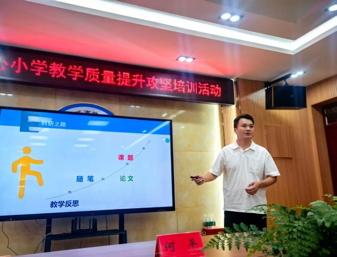 随后,何平老师以《研究“发光”-让您的努力价值最大化》为题进行分享。他将焦点集中在“教学研究与成果转化”上,结合多个真实教学案例,详细讲解了如何从日常教学中挖掘有价值的研究主题、如何系统梳理教学经验形成具体成果,以及如何通过论文、课题等形式让教学努力“被看见、有价值”。他的分享为教师们打通了“从实践到成果”的转化路径,引发了在场教师的广泛共鸣。