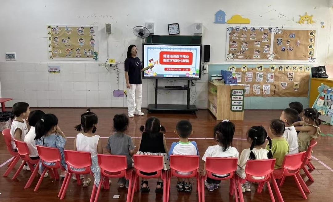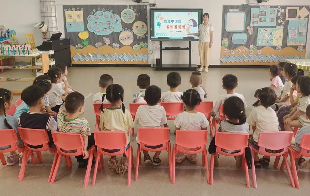 活动伊始,幼儿园通过营造浓厚推普氛围,让“说普通话、用规范字”的理念深入人心。园内随处可见色彩鲜艳的推普宣传海报,教学楼悬挂着醒目的宣传横幅,电子显示屏循环播放推普公益广告,温馨的语言提示渗透在校园的每个角落,吸引着孩子们驻足观看。