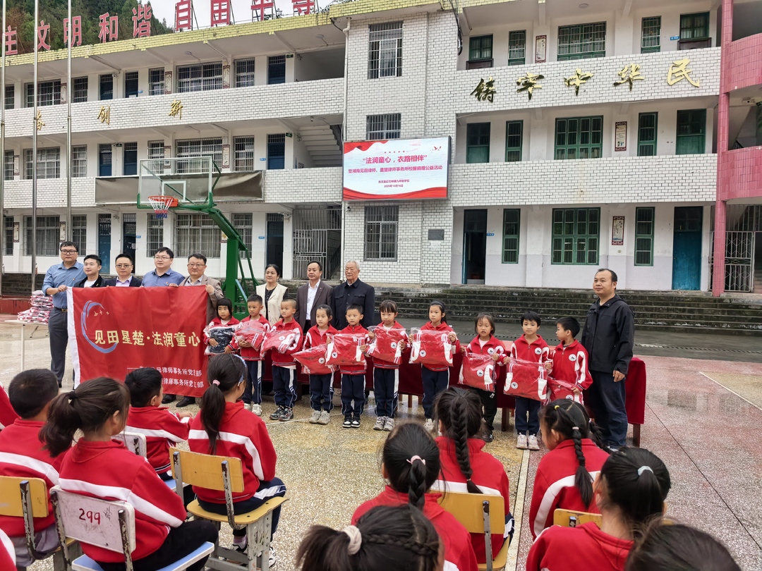 华声在线10月17日讯(通讯员 石梦苇)10月16日上午,古丈县红石林镇九年制学校内暖意浓浓,一场以“法润童心 衣路相伴”为主题的爱心活动在此举行。见田律师事务所、星楚律师事务所、古丈县司法局、县教体局相关代表与该校全体师生共同参与了此次活动。