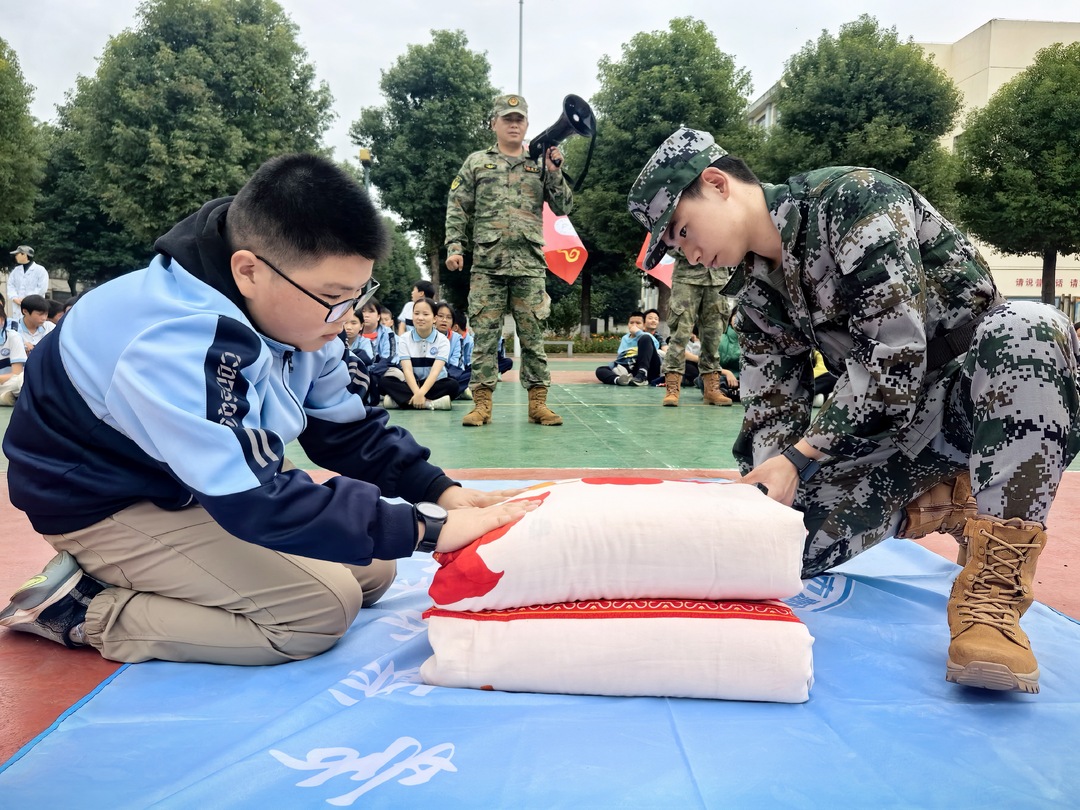 教育周期间,内务整理同样是“重头戏”。操场上迷彩服与校服交叠,教官屈膝弓腰,手把手教大家叠“豆腐块”被子,指尖捏着被角,一点点将松散的被子捋出笔直的折痕,边教边讲解技巧。“下一位,展示!”一声令下,学生快步上前,在教官的帮助下按要领叠出的“豆腐块”被子还像模像样,抬手展示时,脸上满是认真与自豪。