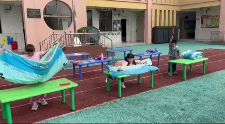 大班幼儿则挑战“穿鞋带系鞋带”“叠被子”“整理书包”等更具挑战性的项目。系鞋带时,孩子们手指翻飞,交叉、打结、拉紧,一步步完成复杂步骤;叠被子环节,他们模仿老师的方法,将被子叠得方方正正;整理书包时,课本、文具、水杯被有序放进对应位置,尽显“小大人”风范。