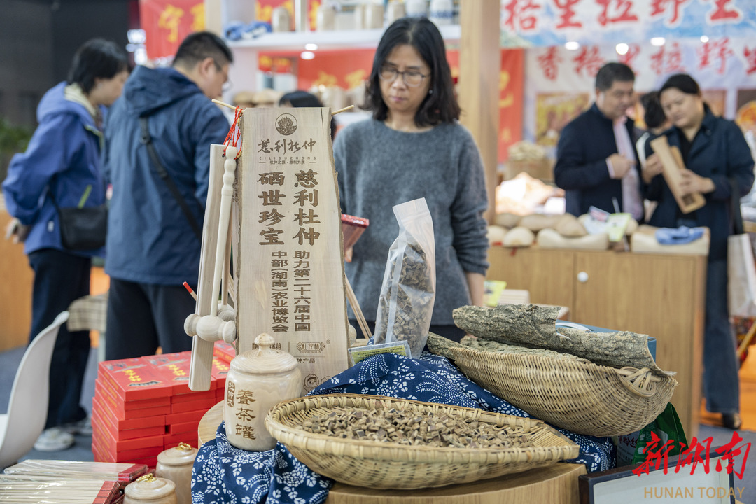 杜仲,原本是一款普通的中药,用它做出来的产品却摆满整个慈利展馆。杜仲面条、杜仲家具、杜仲茶叶、杜仲牙膏、杜仲咖啡……杜仲全身是宝,根茎叶花都可以被开发利用。