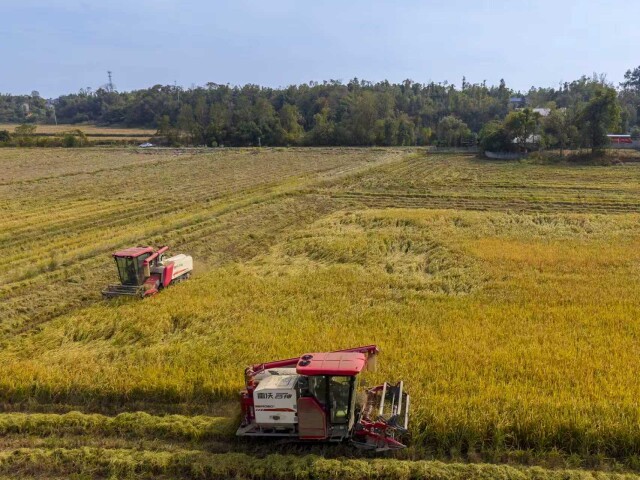 (宁乡市金洲镇箭楼村种植大户黄勇正忙着收割晚稻。湖南日报全媒体记者 童臻熙摄)