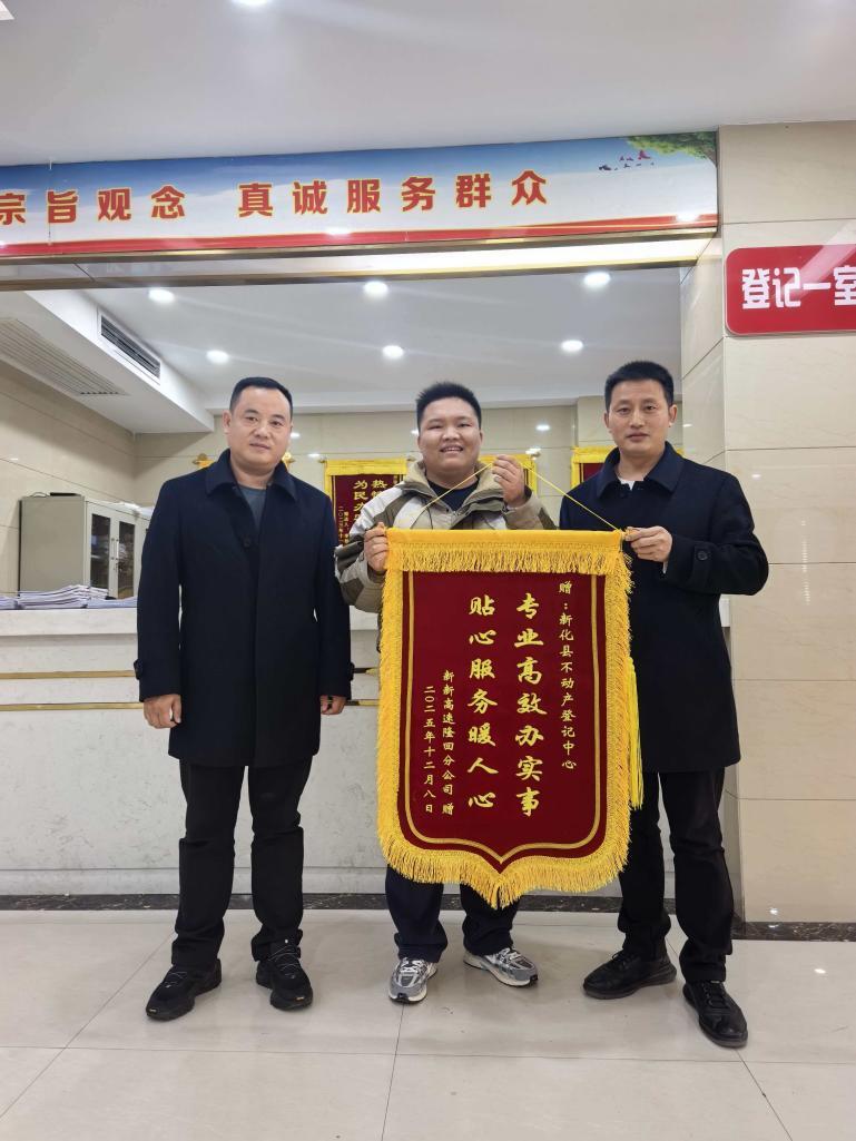 在企业赠送锦旗的现场,工作人员激动地表示:“新新高速公路将于12月26日建成通车,这次办理新新高速新化段19本不动产权证,涉及4个乡镇、建设用地159.68万平方米、征收房屋135栋、农村土地承包经营权地块1409宗,时间紧、要求高,我们原本非常担心会影响整体项目验收进度。没想到不动产登记中心了解情况后,立即启动绿色通道,安排专人对接指导,全程提供‘保姆式’服务。工作人员不仅业务精湛,耐心解答我们的每一个疑问,更主动加班加点,为我们解决了燃眉之急,赢得了宝贵的发展时间!”这番真挚的话语,道出了企业的心声,也印证了中心优质服务的实效。