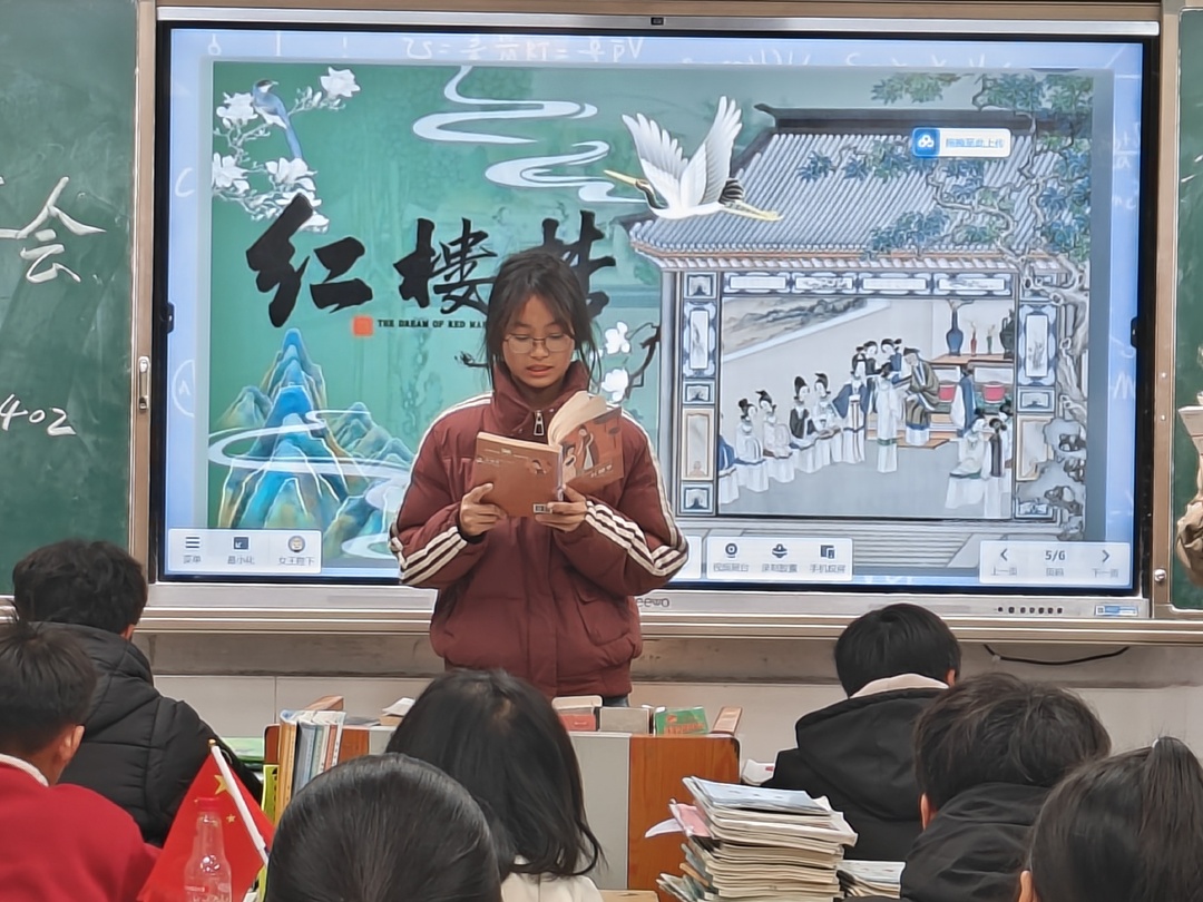 随后,同学们纷纷走上讲台,化身“读书推介官”。有的同学沉醉于《红楼梦》的细腻笔触,分享着黛玉葬花的诗意与悲情。有的同学则钟情于《西游记》的奇幻冒险,讲述着师徒四人披荆斩棘的取经之路。他们手持书本,或深情诵读,或畅谈感悟,将自己与经典的对话传递给每一位听众。
