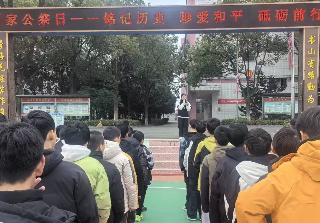 上午10时,全校师生列队集结于校园操场,公祭仪式正式启动。伴随着激昂的国歌旋律,五星红旗缓缓升起,全体师生肃立注目,目光中饱含对祖国的赤诚与对先烈的崇敬;国歌唱毕,全场默哀一分钟,校园内鸦雀无声,唯有对30万遇难同胞的哀思在空气中流淌,同学们低垂头颅,以静默寄托对逝者的沉痛悼念 。