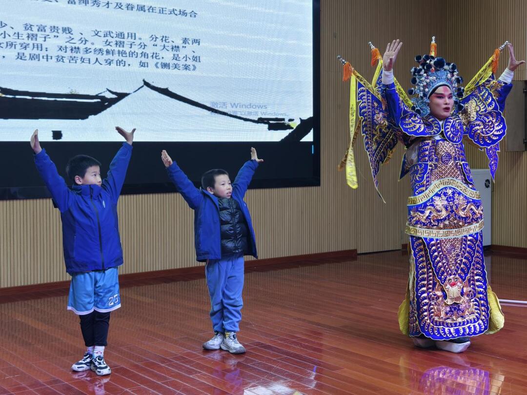 活动现场,湖南省湘剧院一级演员曹威治向学生讲解湘剧表演艺术,学生跟随模仿经典动作。在互动环节中,部分学生上台在青年演员张丽华、付祖田指导下学习戏曲基本身段。