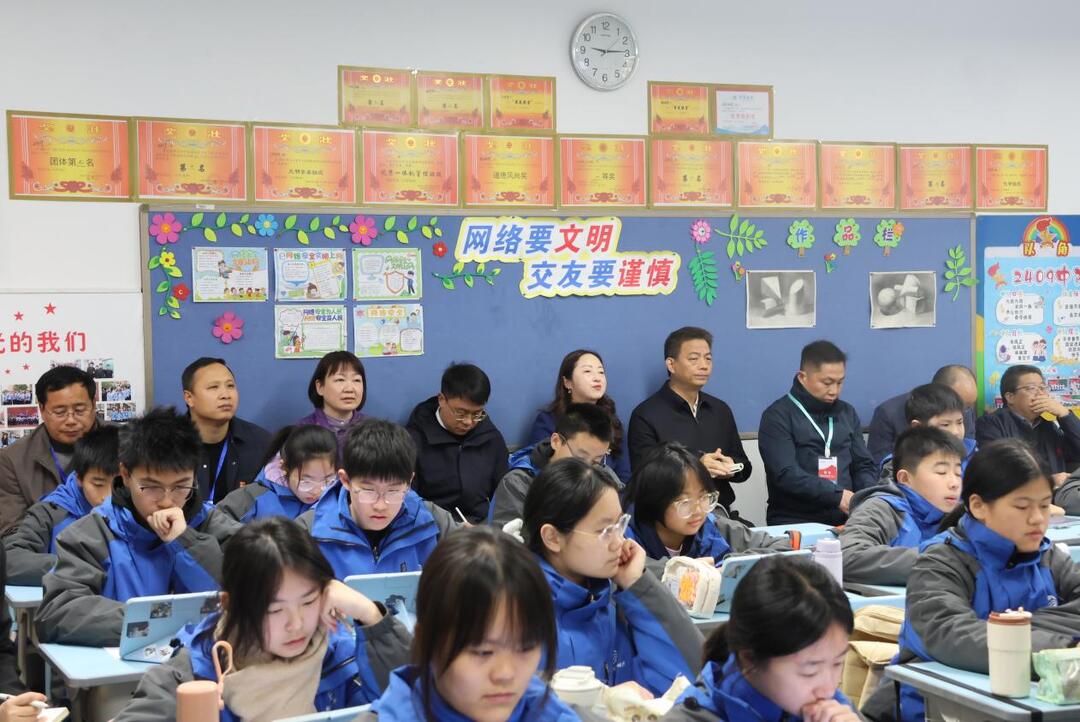 课堂观察,聚焦教学一线。调研组首先深入初中课堂,听取南校区生物教师黄小艳执教的《基因在亲子代间的传递》一课。在随后的交流中,苏建祥校长对本课给予高度评价,肯定其“教师素养高,教态亲切自然、语言干净不啰嗦、板书工整设计好,通过任务驱动、问题导向、合作探究等推进课堂,逻辑分明,层层递进,引人入胜”,称赞该课是“常规课的样板”,并充分肯定了附中双语通过扎实落实“三步三环”集体备课给教师个人专业发展带来的巨大推动力量。同时也对进步优化课堂教学策略提出了宝贵建议。这一环节既体现了调研组对⼀线课堂的深度关注,也彰显了湖南师大附中对教学规范与质量的高位引领。