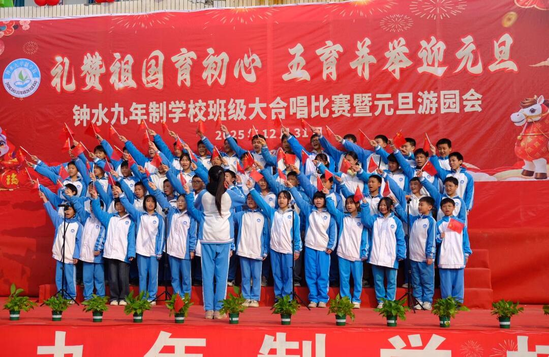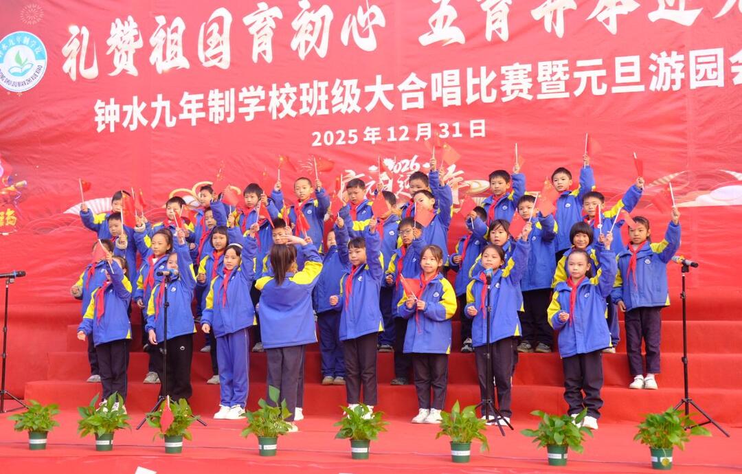 华声在线12月31日讯(通讯员 李庆桂 曹婷)为迎接2026年元旦佳节,厚植学生爱国情怀,落实“五育并举”教育方针,钟水九年制学校于12月31日早上八点在田径场举办“礼赞祖国育初心·五育并举迎元旦”大合唱比赛。全校师生齐聚一堂,用歌声礼赞伟大祖国,用旋律奏响青春华章。