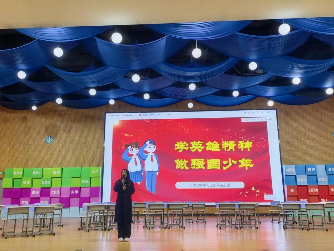 课堂上,家长讲师陈橙妈妈以生动的语言、鲜活的画面,依次讲述了吉鸿昌“我是中国人”的铮铮誓言、“小泥鳅”雨来的机智勇敢、狼牙山五壮士的视死如归、赵一曼的巾帼豪情、王二小的赤子之心以及黄继光的无畏牺牲。“吉鸿昌将军在胸前挂着‘我是中国人’的牌子走在国外街头,这份底气就是对祖国最深的爱。”家长讲师陈橙妈妈的讲解饱含深情,将孩子们带入烽火岁月。为了让孩子们更深入理解英雄精神,讲师还设计了互动提问环节,“雨来是如何躲过敌人搜查的?”“狼牙山五壮士为什么选择跳崖?”一个个问题抛出,同学们纷纷举手、踊跃作答,课堂氛围热烈而活跃,英雄们的精神也在问答间深深烙印在学生心中。