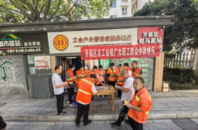 (2025年中秋节当天,长沙司马里工会驿站提供特殊服务,发放月饼给户外劳动者、新就业形态劳动者。 彭雅惠 摄)