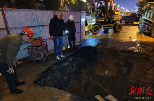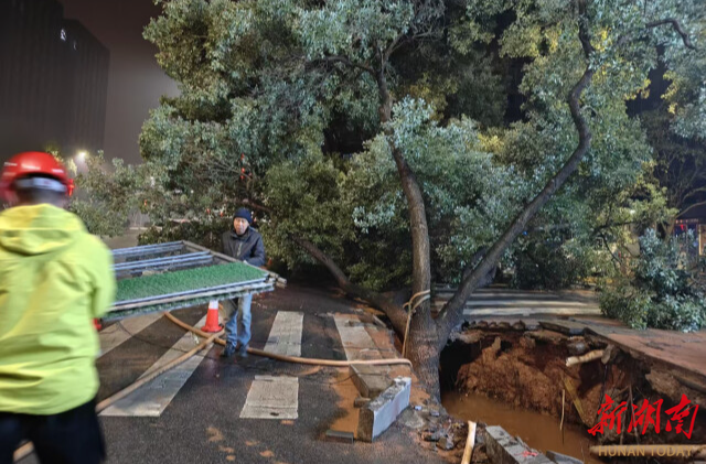 同样是在除夕夜,湘潭市河东大道金桂名城路口突发险情,一棵胸径约40厘米的行道树倒伏,周边交通中断、小区停水。